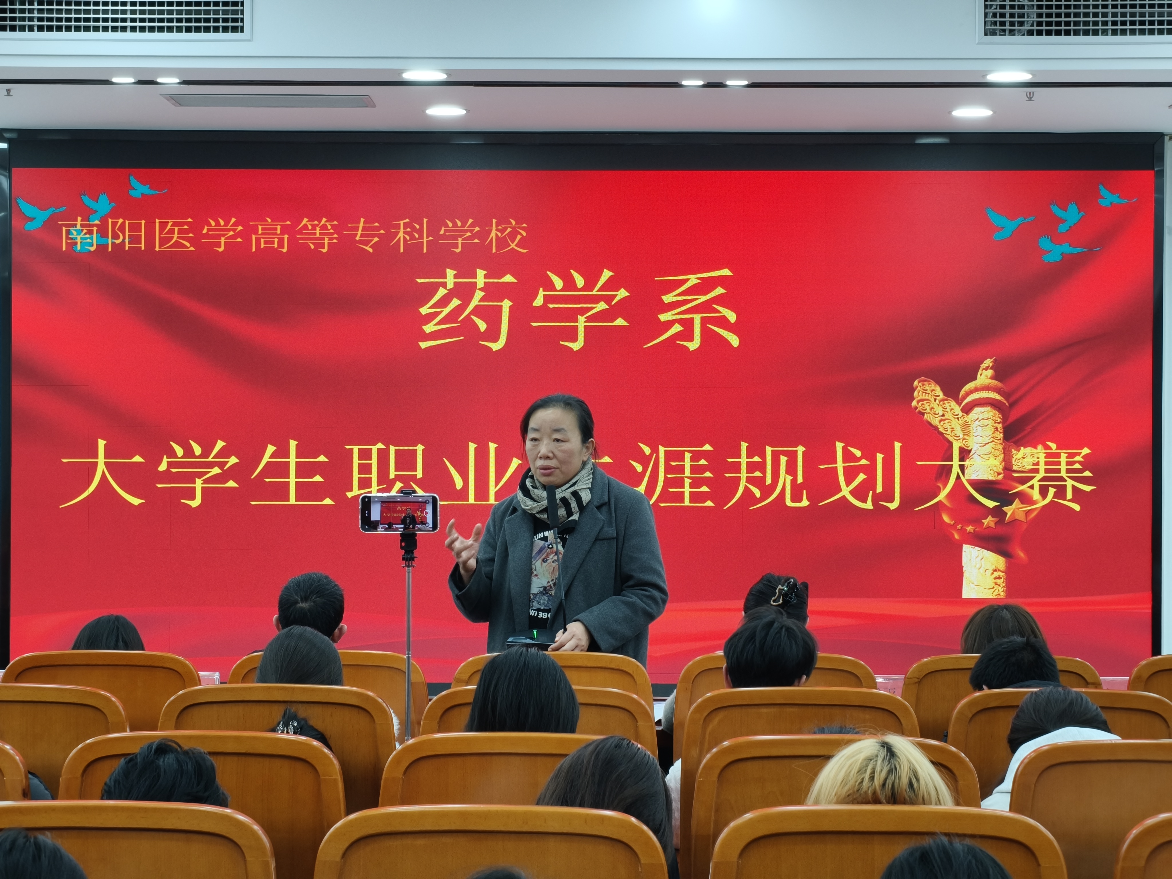 (文|药学系记者站尚丹)为贯彻落实学校强化生涯教育、促进高质量就业的部署要求,引导药学系学子树立科学择业观,精准规划职业路径,全面提升就业竞争力与专业适配度,为未来深耕医药领域筑牢根基,南阳医学高等专科学校药学系于11月20日下午在仲景文化中心隆重举办第三届大学生职业规划大赛选拔赛。药学系金国柱书记、张琳主任、赵伊娜主任、袁欣老师、陈静老师等各位领导及教师出席本次活动,参赛选手与药学系观众共同参与。